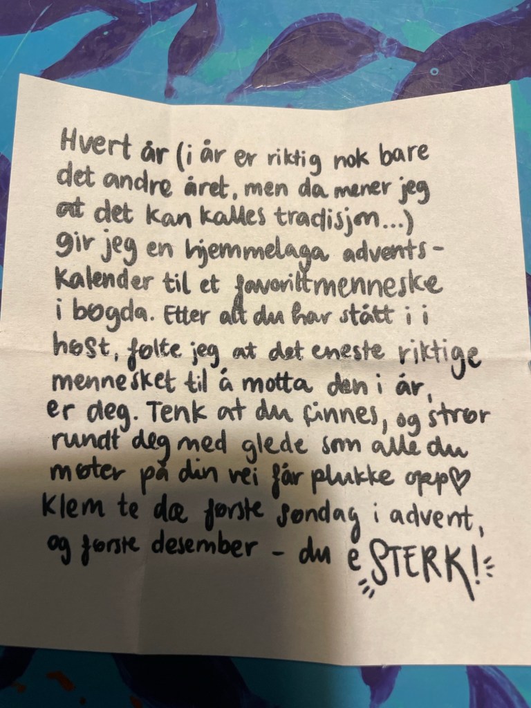 Idag er det første desember , og jeg har som tradisjon laget minst 5 gavekalendere så alle i familien har noe morsomt,sprøtt og fint å fylle «ventetiden» med, men i år ble jeg skikkelig overrasket da en av de beste og varmeste personer jeg vet om (ja og kuleste) kom med hjemmelaget kalender til MEG ❤️uten noen som helst forvarsel får jeg tidenes vakreste, og varmeste julekalender KUN til meg! Jeg kan ikke forklare HVOR takknemlig jeg ble- enn at noen har brukt så mye tid og kjærlighet på en gave til meg🥰 Det er den største gaven- TIDEN ❤️