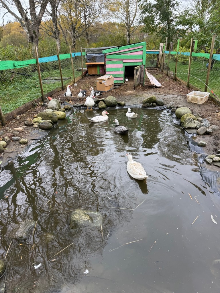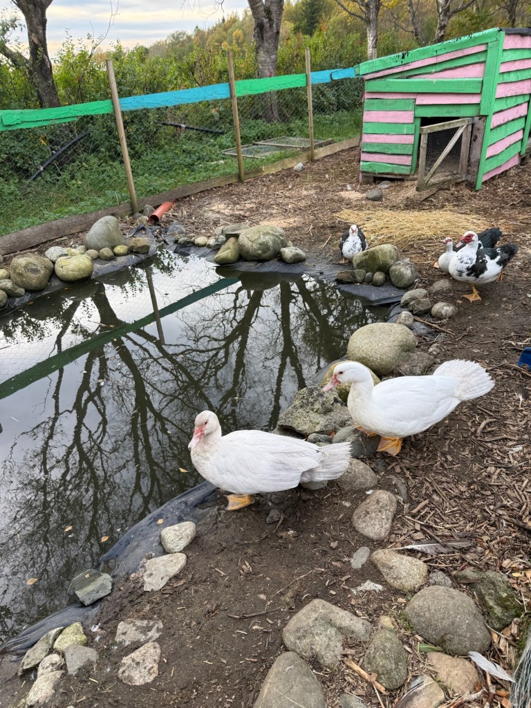 Kom å hils på de nye endene Polkabritt, Midnatt,Emilie, Anna og Ariel 🥰 vi fyrer som vanlig i lavvoen, og det er mulig å kose med alle dyrene ❤️